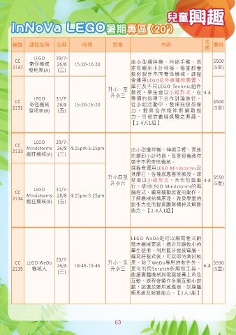 CC LEGO WeDo 26/8 18:45-19:45 升小一至 果。除了WeDo專用的軟件外, 6-8 $550