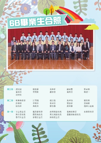 6B畢業生合照 第三排: 成以諾 賴俊霖 馬梓軒 謝綽豐 鄧卓楠 黃梓林 李奕朗 嚴崇晉 賴天信 陳諾一 胡焯熙 第二排: 郭榮梅老師 江可晴 錢芷盈 吳卓珈 關恩霖 許晴晴 李靖昤 蔡卓彤 雲詠詩 張曉晴 姚洛婷 馬皓欣 鄭悅蕎 姚焯蕎 潘綺心姑娘 第一排: 甘立德主任 羅家健老師 姚榮錦副校長 曾美娟會吏 余勝意牧師 陳永堅校監 顏偉亮校長 樊文輝副校長 黃勵德助理校長 香巧玲主任 麥慧芬主任 陳倩雯主任 8