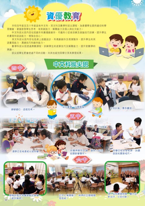 本校四年級至及六年級設有中文科、英文科及數學科拔尖課程,為資優學生提供適切的學