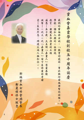 寶血會嘉靈學校創校五十周年誌慶 愛|生生不息,締造天地人融和合一! 凝聚|一代又一代「嘉靈人」寫下生命愛的奇蹟 感恩|五十載,天主對「嘉靈人」慈愛眷顧 教育,傳遞生命與愛的工程 學校,猶如人類的一位母親 我們的會祖修女說:「教育的使命,等於執行母親神聖的任務。」 耶穌寶血女修會總會長 鄺麗娟修女致意 3