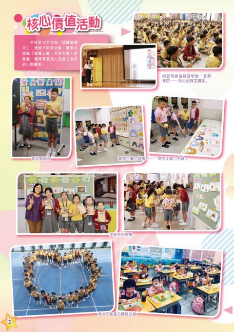 心 心 值值 動 核 價 動 核 價 活活 本校把10月定為「認識義德 月」,透過不同的活動,讓學生 認識「維護正義、平等和諧」的 意義,懂得尊重別人及建立良好 的人際關係。 與宣明會協辦宣明會「貧窮 與宣明會協辦宣明會「貧窮 書院 書院——消失的課室講座」消失的課室講座」 義德月攤位遊戲——「尋找正義小先鋒」「尋找正義小先鋒」 聖詠點唱站 義德月攤位遊戲 聖詠點唱站 展板問答遊戲 展板問答遊戲 清淡一餐童工體驗活動 清淡一餐童工體驗活動 2 2