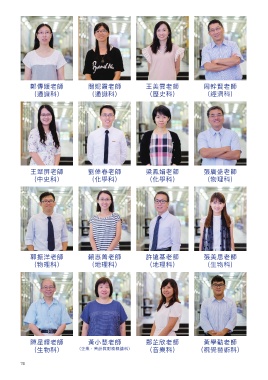 鄭傳媛老師 關妮霞老師 王美雲老師 周幹賢老師 (通識科) (通識科) (歷史科) (經濟科) 王翠屏老師 劉偉春老師 梁鳳娟老師 張廣盛老師 (中史科) (化學科) (化學科) (物理科) 郭振洋老師 賴惠菁老師 許遠基老師 張美思老師 (物理科) (地理科) (地理科) (生物科) 陳星輝老師 黃小慧老師 鄭芷欣老師 黃學勤老師 (生物科) (企業,會計與財務概論科) (音樂科) (視覺藝術科) 74