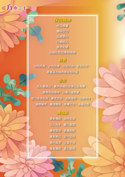 方小三十 保良精神 相互尊重 團結合力 延展愛心 行善助人 感恩知德 造福社群的奉獻精神 願景 幼有所育,少有所學,壯有所為,老有所依, 貧寡孤困殘病者皆有所望 使命 成為最傑出、最具承擔的慈善公益機構, 發揮保良精神,以善心建善業, 致力保赤安良,護老扶弱,助貧健診,培德育才, 揚康樂眾,實踐環保,承傳文化,造福社群 價值觀 秉承傳統 與時並進 以人為本 關心感恩 優良管治 務實創新 廉潔奉公 安不忘危 善用資源 注重本益 專業團隊 愛心服務