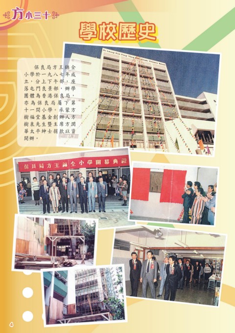 方小三十 學校歷史 保良局方王錦全 小學於一九八七年成 立,分上下午部,座 落屯門良景邨,辦學 團體為香港保良局, 亦為保良局屬下第 十一間小學。承蒙方 樹福堂基金創辦人方 樹泉先生暨主席方潤 華太平紳士捐款以資 開辦。 4