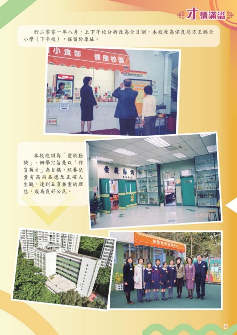才情滿溢 於二零零一年八月,上下午校分拆改為全日制,本校原為保良局方王錦全 小學(下午校),保留於原址。 本校校訓為「愛敬勤 誠」,辦學宗旨是以「作 育英才」為目標,培養兒 童有高尚品德及正確人 生觀,達到五育並重的理 想,成為良好公民。 5