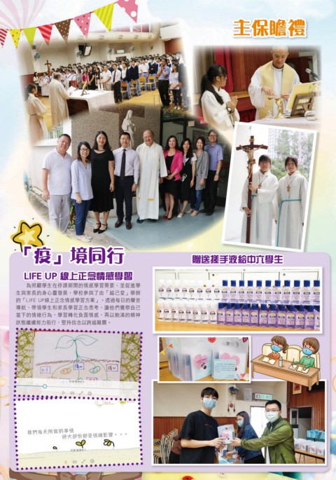 主保瞻禮 「疫」境同行 贈送搓手液給中六學生 LIFE UP 線上正念情感學習 為照顧學生在停課期間的情感學習需要,並促進學 生與家長的身心靈發展,學校參與了由「越己堂」舉辦 的「LIFE UP線上正念情感學習方案」。透過每日的聲音 導航,帶領學生和家長學習正念思考,讓他們覺察自己 當下的情緒行為,學習轉化負面情感,再以飽滿的精神 狀態繼續努力前行,堅持信念以跨越難關。