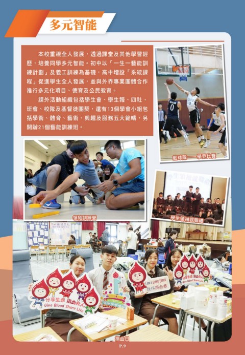 多元智能 本校重視全人發展,透過課堂及其他學習經 歷,培養同學多元智能。初中以「一生一藝能訓 練計劃」及義工訓練為基礎,高中增設「系統課 程」促進學生全人發展,並與外界專業團體合作 推行多元化項目、德育及公民教育。 課外活動組織包括學生會、學生報、四社、 班會、校隊及基督徒團契,還有13個學會小組包 括學術、體育、藝術、興趣及服務五大範疇,另 開辦21個藝能訓練班。 籃球隊—學界比賽 領袖訓練營 學生領袖就職禮 捐血日 P.9