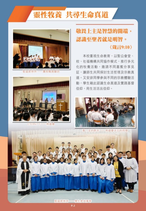 靈性牧養 共尋生命真道 敬畏上主是智慧的開端, 認識至聖者就是明智。 〈箴言9:10〉 本校重視生命教育,以聖公會堂、 校、社福機構共同協作模式,推行多元 化的牧養活動,邀請不同嘉賓分享見 聖誕節崇拜—團契職員獻詩 証,讓師生共同探討生活哲理及宗教真 道。又安排同學參與不同的宗教體驗活 動,學生藉此認識生命真道及實踐基督 信仰,用生活活出信仰。 ETERNITY—佈道會 看!主的群羊—佈道會決志的同學 聖誕節崇拜—學生參與事奉 P.2