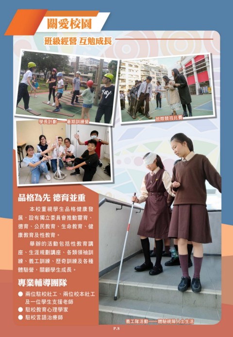關愛校園 班級經營 互勉成長 班際競技比賽 學長計劃—暑期訓練營 品格為先 德育並重 本校重視學生品格健康發 展,設有獨立委員會推動靈育、 德育、公民教育、生命教育、健 康教育及性教育。 舉辦的活動包括性教育講 座、生涯規劃講座、各類領袖訓 練、義工訓練、歷奇訓練及各種 體驗營,關顧學生成長。 專業輔導團隊 ● 兩位駐校社工、兩位校本社工 及一位學生支援老師 ● 駐校教育心理學家 ● 駐校言語治療師 義工隊活動—體驗視障人士生活 P.8