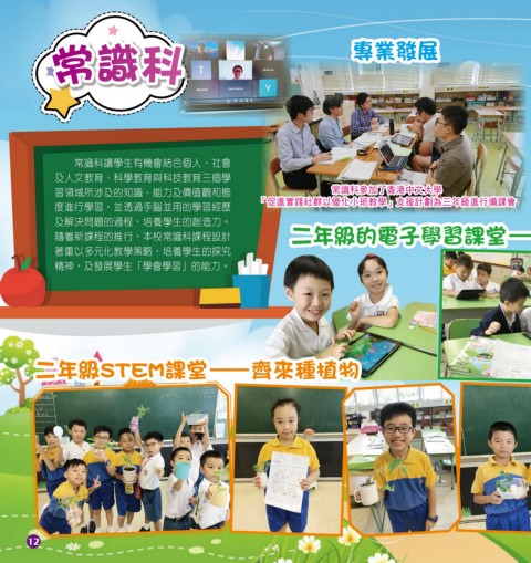 常識科 專業發展 常識科讓學生有機會結合個人、社會 及人文教育、科學教育與科技教育三個學 習領域所涉及的知識、能力及價值觀和態 常識科參加了香港中文大學 度進行學習,並透過手腦並用的學習經歷 「促進實踐社群以優化小班教學」支援計劃為三年級進行備課會 及解決問題的過程,培養學生的創造力。 隨着新課程的推行,本校常識科課程設計 二年級的電子學習課堂—白天與黑夜 著重以多元化教學策略,培養學生的探究 精神,及發展學生「學會學習」的能力。 二年級STEM課堂—齊來種植物 12