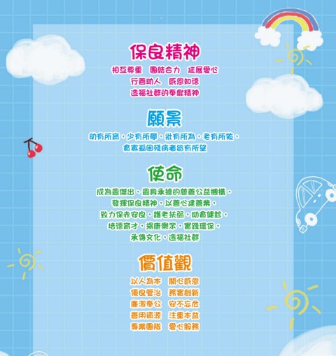 保良精神 相互尊重 團結合力 延展愛心 行善助人 感恩知德 造福社群的奉獻精神 願景 幼有所育,少有所學,壯有所為,老有所依, 貧寡孤困殘病者皆有所望 使命 成為最傑出、最具承擔的慈善公益機構, 發揮保良精神,以善心建善業, 致力保赤安良,護老扶弱,助貧健診, 培德育才,揚康樂眾,實踐環保, 承傳文化,造福社群 價值觀 以人為本 關心感恩 優良管治 務實創新 廉潔奉公 安不忘危 善用資源 注重本益 專業團隊 愛心服務