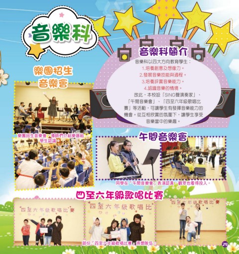音樂科 音樂科簡介 音樂科以四大方向教育學生︰ 樂團招生 1.培養創意及想像力。 2.發展音樂技能與過程。 音樂會 3.培養評賞音樂能力。 4.認識音樂的情境。 故此,本校設「SING聲演奏家」、 「午間音樂會」、「四至六年級歌唱比 賽」等活動,可讓學生有發揮音樂能力的 機會。從互相欣賞的氛圍下,讓學生享受 音樂當中的樂趣。 樂團招生音樂會,導師們介紹樂器給 午間音樂會 學生認識。 同學在「午間音樂會」表演認真,觀眾也看得投入。 四至六年級歌唱比賽 部份「四至六年級歌唱比賽」得獎隊伍。 29