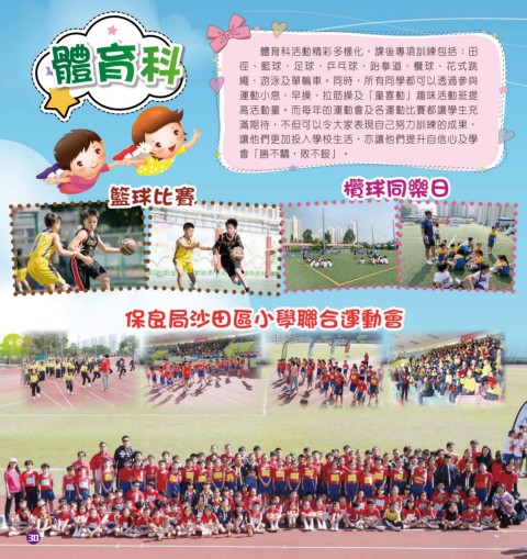體育科 體育科活動精彩多樣化,課後專項訓練包括:田 徑、籃球、足球、乒乓球、跆拳道、欖球、花式跳 繩、游泳及單輪車。同時,所有同學都可以透過參與 運動小息、早操、拉筋操及「童喜動」趣味活動班提 高活動量。而每年的運動會及各運動比賽都讓學生充 滿期待,不但可以令大家表現自己努力訓練的成果, 讓他們更加投入學校生活,亦讓他們提升自信心及學 會「勝不驕,敗不餒」。 籃球比賽 欖球同樂日 保良局沙田區小學聯合運動會 30