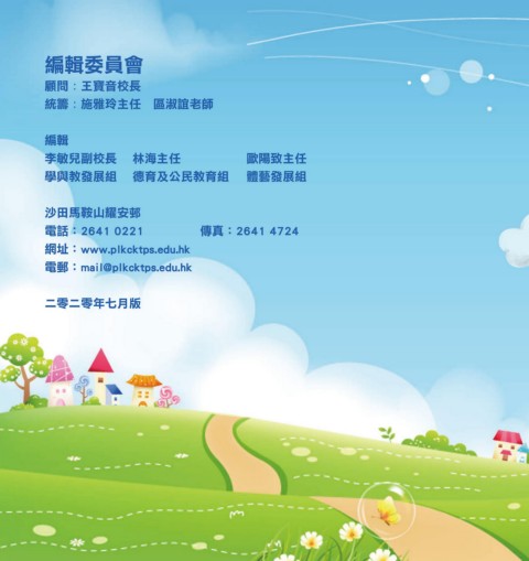編輯委員會 顧問 : 王寶音校長 統籌 : 施雅玲主任 區淑誼老師 編輯 李敏兒副校長 林海主任 歐陽致主任 學與教發展組 德育及公民教育組 體藝發展組 沙田馬鞍山耀安邨 電話:2641 0221 傳真:2641 4724 網址:www.plkcktps.edu.hk 電郵:mail@plkcktps.edu.hk 二零二零年七月版
