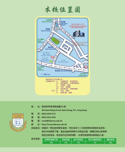報名辦法:申請中一學位的同學及家長,可於每年十二月初到學校索取報名表格,