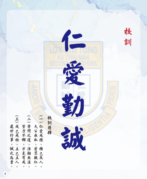 仁 校 訓 愛 勤 ( 三 ( 二 ( 一 校訓簡釋 處世行事,誠之為貴。 ) 成己成物,立己立人, 努力不懈,方克有成。 ) 學問之道,浩瀚無涯, 大公無私,愛眾親仁。 ) 仁愛成德,推己及人, 誠 4