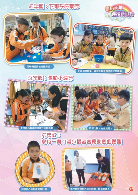 四年級:下雨天好幫手 創科天地 迎接新世代 同學們認真地進行測試。 紀錄測試結果,為設計除水器作最好的準備。 五年級:運動小涼伴 老師細心教導同學進行分組活動。 同學之間,合作無間。 六年級: 家有一寶:減少長者容易跌倒的問題 同學用心設計拖鞋設計圖。 進行拖鞋測試大比拼活動,緊張刺激! 17