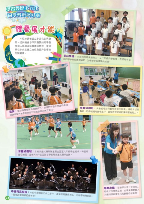 歌詠:歌詠隊教授隊員發聲技巧、感情的抒發及樂曲的處理, 奧數培訓班:奧數組培訓具數學潛質的同學。透過參加奧
