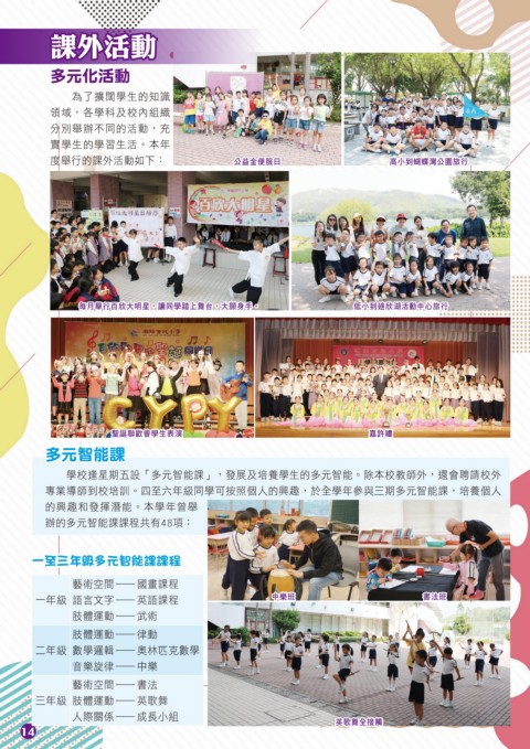 學校逢星期五設「多元智能課」,發展及培養學生的多元智能。除本校教師外,還會聘請校外
