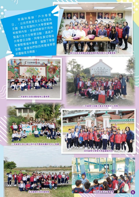 常識科舉辦 「 戶外學習 日」,以自然教育及文化保育為 主題,配合常識科六大學習範疇 和教學內容,安排同學到不同地 點進行全方位學習活動。透過戶 外學習日活動,同學在真切情境 和實際環境中學習,擴闊了學習 空間,增進他們對四周環境學習 的靈敏度及興趣。 學生到香港潮陽同鄉會與陳校監和顏文正會董會面 一年級學生到香港動植物公園考察 二年級學生到獅子會自然教育中心考察 三年級學生到大埔元洲仔自然環境保護研究中心參觀 四年級學生學習中西區建築特色 五年級學生到米埔考察 六年級到海洋公園考察 9