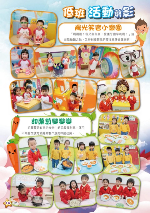 低班 活動剪影 陽光笑容小樂園 「刷刷刷!我又刷刷刷!愛護牙齒早晚刷!」這 首歌動聽之餘,又時刻提醒我們要注意牙齒健康啊! 胡蘿蔔變變變 胡蘿蔔是有益的食物!幼兒發揮創意,運用 不同的烹調方式將其製作成美味的佳餚。 14