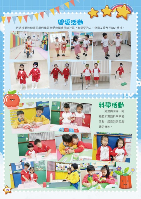 關愛活動 透過模擬活動讓同學們學習將愛與關懷帶給社區上有需要的人,發揮友愛及互助之精神。 科學活動 通過與同伴一同 遊戲和實踐科學學習 活動,感受到天父創 造的奇妙。 18