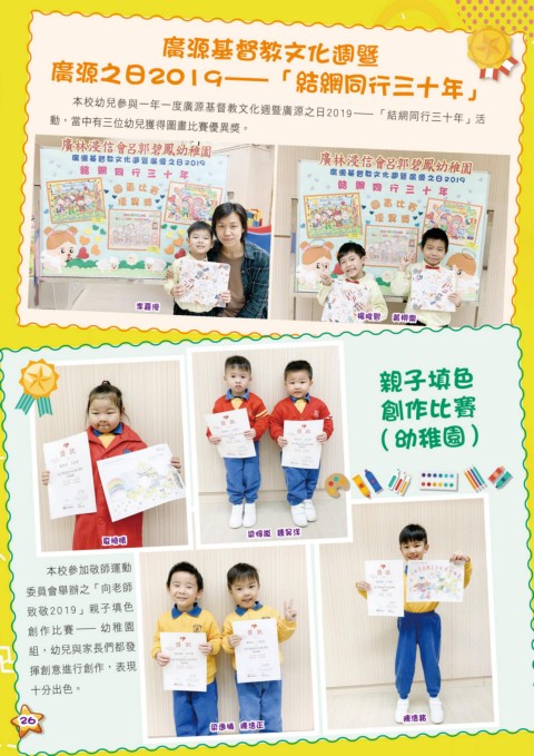 廣源基督教文化週暨 廣源之日2019—「結網同行三十年」 本校幼兒參與一年一度廣源基督教文化週暨廣源之日2019— 「結網同行三十年」活 動,當中有三位幼兒獲得圖畫比賽優異獎。 李嘉濠 楊晙熙 黃栩樂 親子填色 創作比賽 (幼稚園) 梁惇嵐 鍾昊洋 夏曉晴 本校參加敬師運動 委員會舉辦之「向老師 致敬2019」親子填色 創作 比賽 — 幼稚 園 組,幼兒與家長們都發 揮創意進行創作,表現 十分出色。 26 陳浩銘 梁逸楠 陳浩正