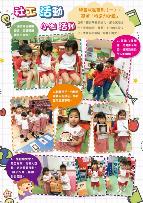 社工 活動 學童成長系列(一): 高班「抗逆力小組」 小組 活動 目標:提升學童抗逆力,配合家校合 1.運送雞蛋體驗 作,推動和諧、關愛、支持的抗逆文 遊戲,認識問想 化。主題包括情緒、解難和關愛。 揀做四步曲。 2.認識八種情 緒,透過影子遊 戲,覺察自己及 別人的情緒。 3.聆聽例子,分辦正 和負向的想法,學習 正向回應事情。 4. 學習關愛家人, 角色扮演,與家人互 動,送上關愛行動。 (親子按摩、擁抱、 說說愛語) 28