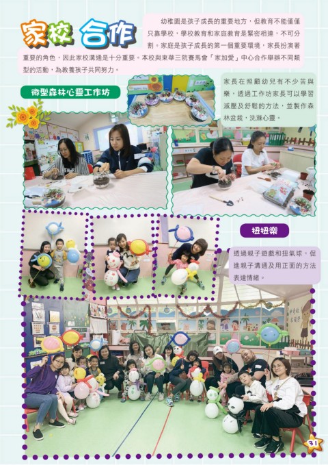 家校 合作 幼稚園是孩子成長的重要地方,但教育不能僅僅 只靠學校,學校教育和家庭教育是緊密相連,不可分 割。家庭是孩子成長的第一個重要環境,家長扮演著 重要的角色,因此家校溝通是十分重要。本校與東華三院賽馬會「家加愛」中心合作舉辦不同類 型的活動,為教養孩子共同努力。 家長在照顧幼兒有不少苦與 微型森林心靈工作坊 樂,透過工作坊家長可以學習 減壓及舒鬆的方法,並製作森 林盆栽,洗滌心靈。 扭扭樂 透過親子遊戲和扭氣球,促 進親子溝通及用正面的方法 表達情緒。 31