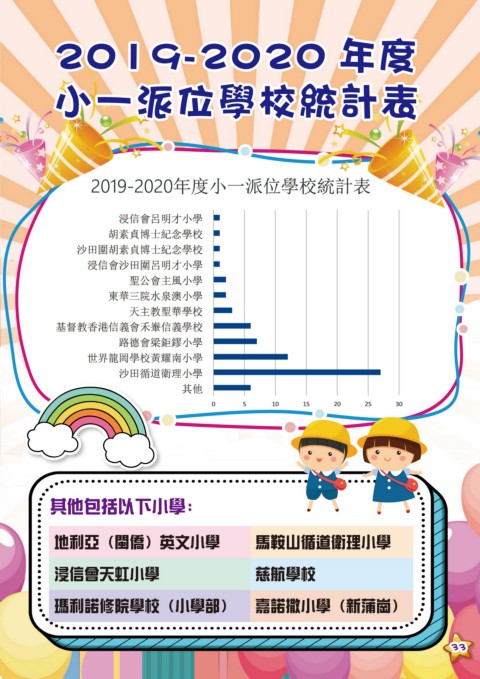 2019-2020 年度 小一派位學校統計表 其他包括以下小學: 地利亞(閩僑)英文小學 馬鞍山循道衛理小學 浸信會天虹小學 慈航學校 瑪利諾修院學校(小學部) 嘉諾撒小學(新蒲崗) 33