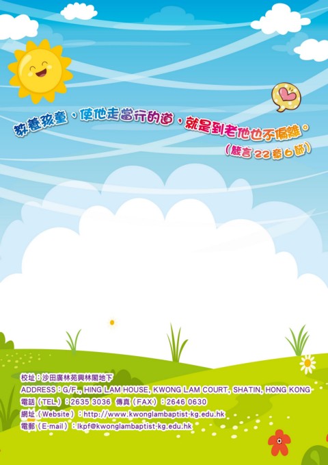 教養孩童,使他走當行的道,就是到老他也不偏離。 (箴言 22 章 6 節) 校址:沙田廣林苑興林閣地下 ADDRESS:G/F., HING LAM HOUSE, KWONG LAM COURT, SHATIN, HONG KONG 電話(TEL):2635 3036 傳真(FAX):2646 0630 網址(Website):http://www.kwonglambaptist-kg.edu.hk 電郵(E-mail):lkpf@kwonglambaptist-kg.edu.hk