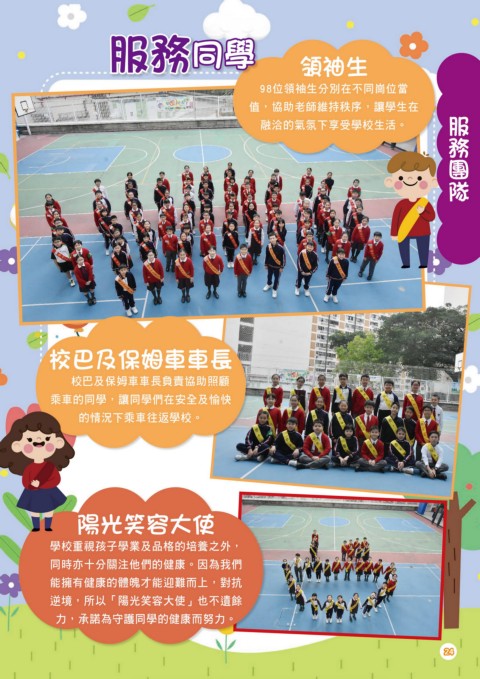 盡忠 職守 服務 同學 領袖生 98位領袖生分別在不同崗位當 值,協助老師維持秩序,讓學生在 服務團隊 融洽的氣氛下享受學校生活。 校巴及保姆車車長 校巴及保姆車車長負責協助照顧 乘車的同學,讓同學們在安全及愉快 的情況下乘車往返學校。 陽光笑容大使 學校重視孩子學業及品格的培養之外, 同時亦十分關注他們的健康。因為我們 能擁有健康的體魄才能迎難而上,對抗 逆境,所以「陽光笑容大使」也不遺餘 力,承諾為守護同學的健康而努力。 24