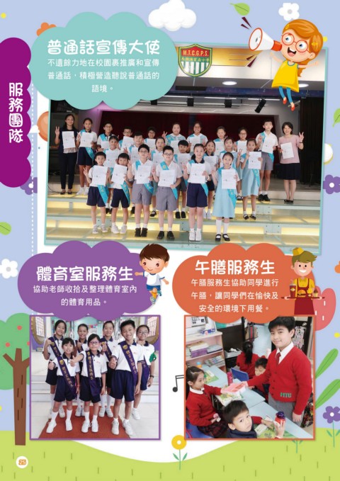 普通話宣傳大使 不遺餘力地在校園裹推廣和宣傳 服務團隊 普通話,積極營造聽說普通話的 語境。 體育室服務生 午膳服務生 午膳服務生協助同學進行 協助老師收拾及整理體育室內 午膳,讓同學們在愉快及 的體育用品。 安全的環境下用餐。 25
