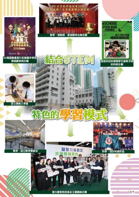 數學﹕奧數隊、參加數學比賽活動 3D電腦動畫推行從動畫中學習 結合 STEM 價值觀教育計劃 資訊科技科帶領學生參與不同 的科研計劃 設立機械人學會 特色的學習模式 數學﹕設立數學實驗室 科學﹕設計科創作品 推行優質教育基金主題網絡計劃 17