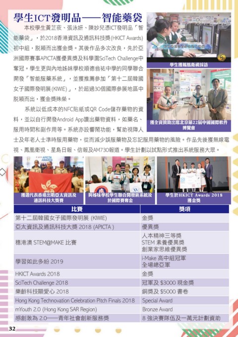 獲選代表香港出戰亞太資訊及 與姊妹學校學生聯合開發新系統及 學生於HKICT Awards 2018