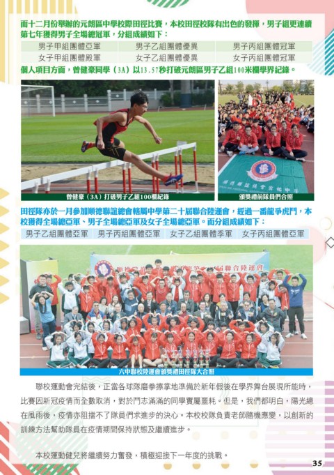 而十二月份舉辦的元朗區中學校際田徑比賽,本校田徑校隊有出色的發揮,男子組更連續