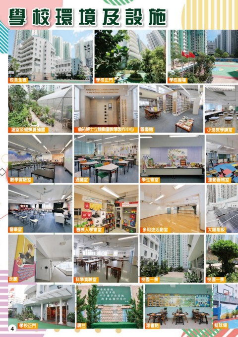 學 校 環 境 及 設 施 校舍全貌 學校正門 學校操場 溫室及蝴蝶養殖園 翁祐博士立體動畫教學製作中心 圖書館 小班教學課室 數學實驗室 通識室 學生會室 運動器械室 音樂室 機械人學會室 多用途活動室 太陽能板 走廊 科學實驗室 校園一景 校園一景 學校正門 講台 漂書點 籃球場 4