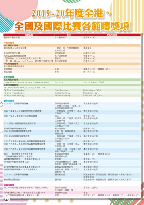 2020 香港國際數學競賽初賽 一等獎五項、二等獎十八項及 本校數學科校隊