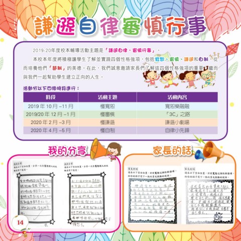 2019-20年度校本輔導活動主題是「謙遜自律,審慎行事」。