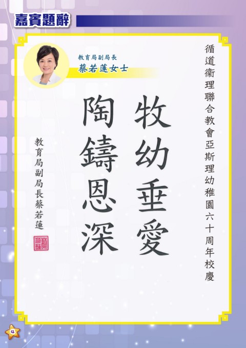 嘉賓題辭 循道衞理聯合教會亞斯理幼稚園六十周年校慶 教育局副局長 蔡若蓮女士 4