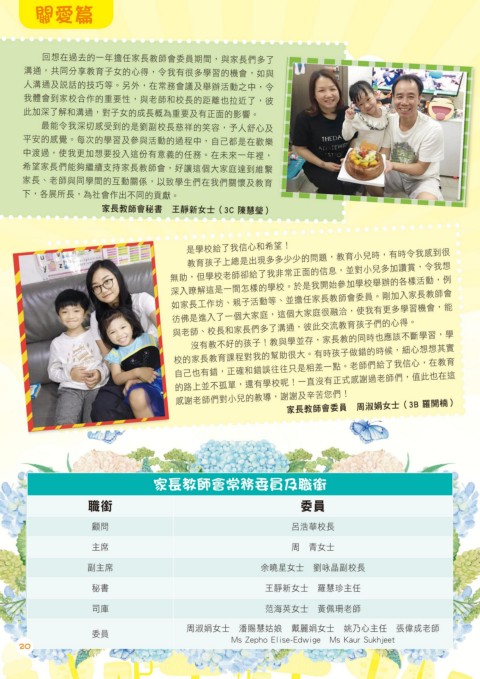 如家長工作坊、親子活動等、並擔任家長教師會委員。剛加入家長教師會