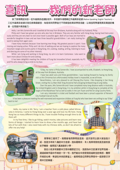 除了教育局安排的一名外籍英語老師駐校外,本校額外增聘兩位外籍英語老師 (Native-Speaking English Teachers),