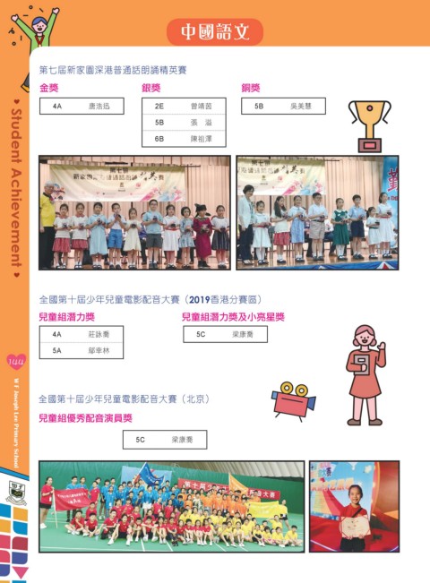中國語文 第七屆新家園深港普通話朗誦精英賽 金獎 銀獎 銅獎 4A 唐浩迅 2E 曾靖茵 5B 吳美慧 5B 張 溢 6B 陳祖澤 Student Achievement 全國第十屆少年兒童電影配音大賽(2019香港分賽區) 兒童組潛力獎 兒童組潛力獎及小亮星獎 4A 莊詠喬 5C 梁康喬 5A 鄔幸林 144 全國第十屆少年兒童電影配音大賽(北京) 兒童組優秀配音演員獎 5C 梁康喬 W F Joseph Lee Primary School