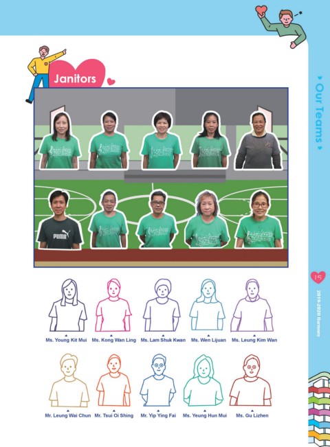 Janitors Our Teams 15 Ms. Young Kit Mui Ms. Kong Wan Ling Ms. Lam Shuk Kwan Ms. Wen Lijuan Ms. Leung Kim Wan 2019-2020 Harmony Mr. Leung Wai Chun Mr. Tsui Oi Shing Mr. Yip Ying Fai Ms. Yeung Hun Mui Ms. Gu Lizhen