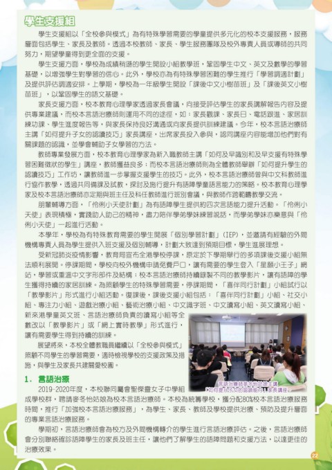 練功課、學生進度報告等,與家長保持良好溝通或向家長提供訓練建議。今年,校本言語治療師