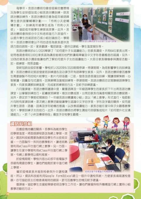 智解讀、詞彙及句式運用、因果解釋及匯報訓練等。停課期間,言語治療師亦定期聯絡語障學生