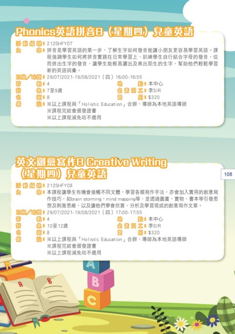 備 註 : ※以上課程與「Holistic Education」合辦,導師為本地英語導師