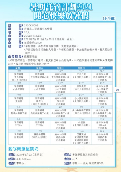 日期︰2021年8月22(星期日) 對象︰暑託學員及其家庭成員