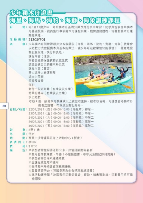 目 的 : 向8至11歲少年,介紹獨木舟基礎知識及進行水中練習,使學員能掌握到獨木