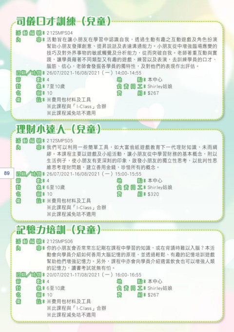 89 日期/時間: 26/07/2021-16/08/2021(一)15:00-15:55